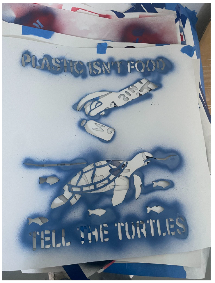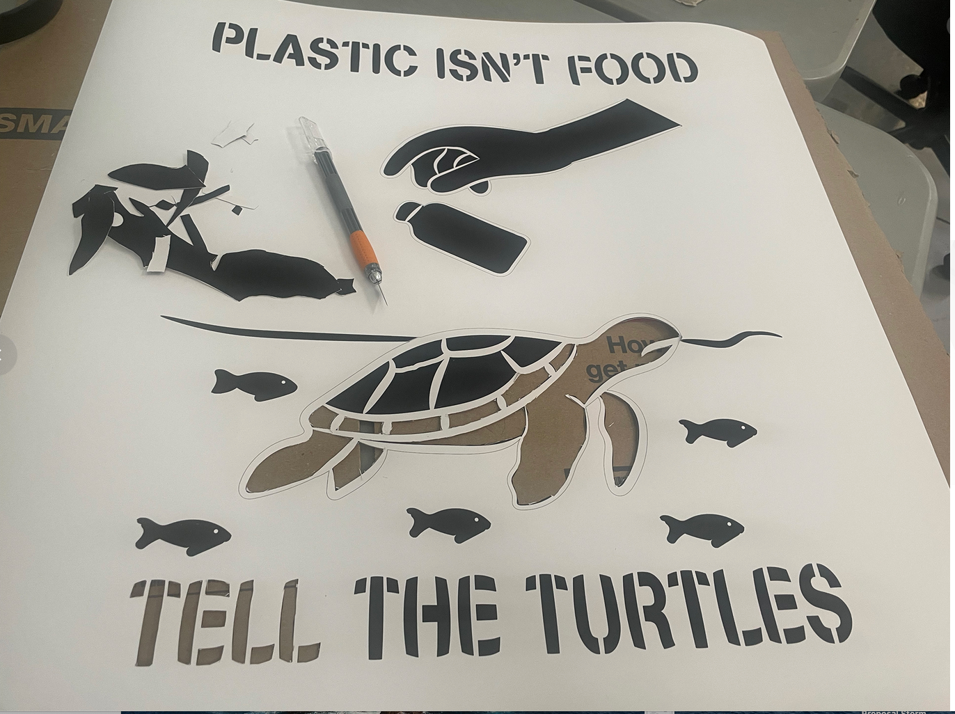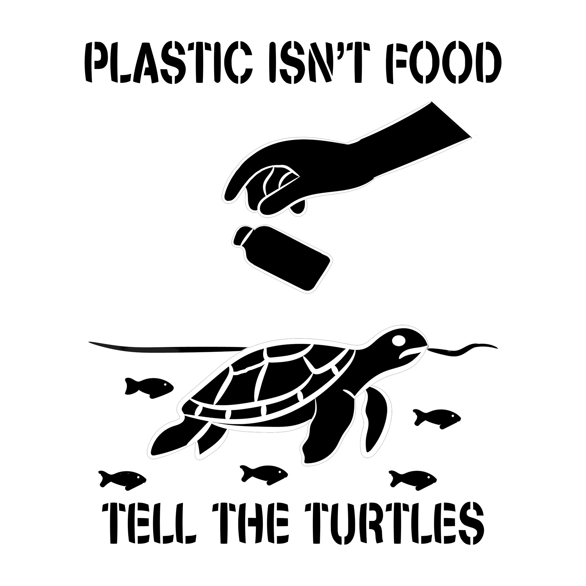 This stencil shows a hand tossing a plastic bottle above a sea turtle and smaller fish, paired with the slogan “PLASTIC ISN’T FOOD - TELL THE TURTLES.” It highlights how careless disposal harms marine life, with the turtle representing vulnerable creatures affected by trash in our waterways. The design reminds viewers that every piece of litter